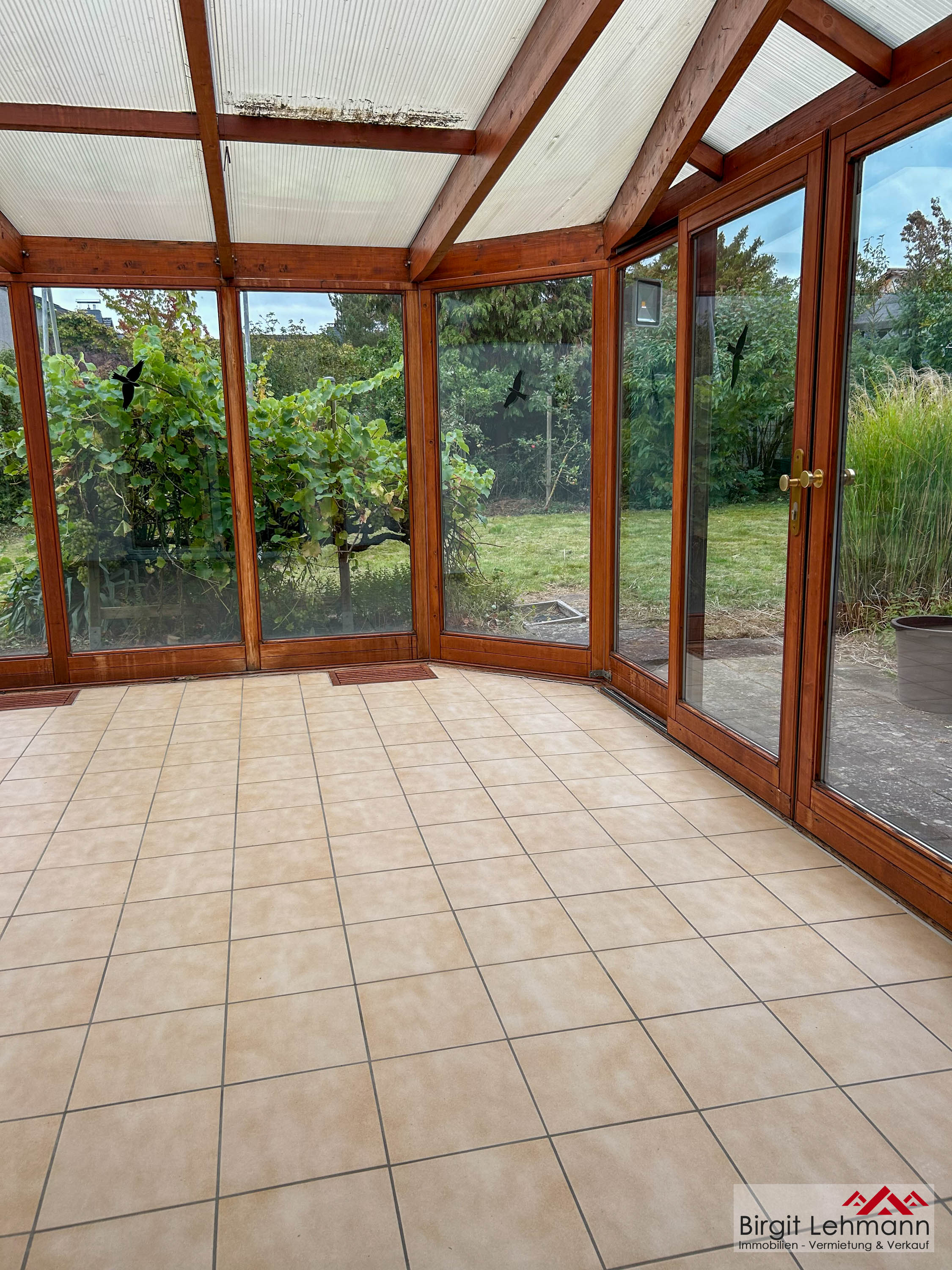 Ein schöner Wintergarten sowie eine große Fensterfront im Wohnbereich bieten einen direkten Blick in den Garten.
